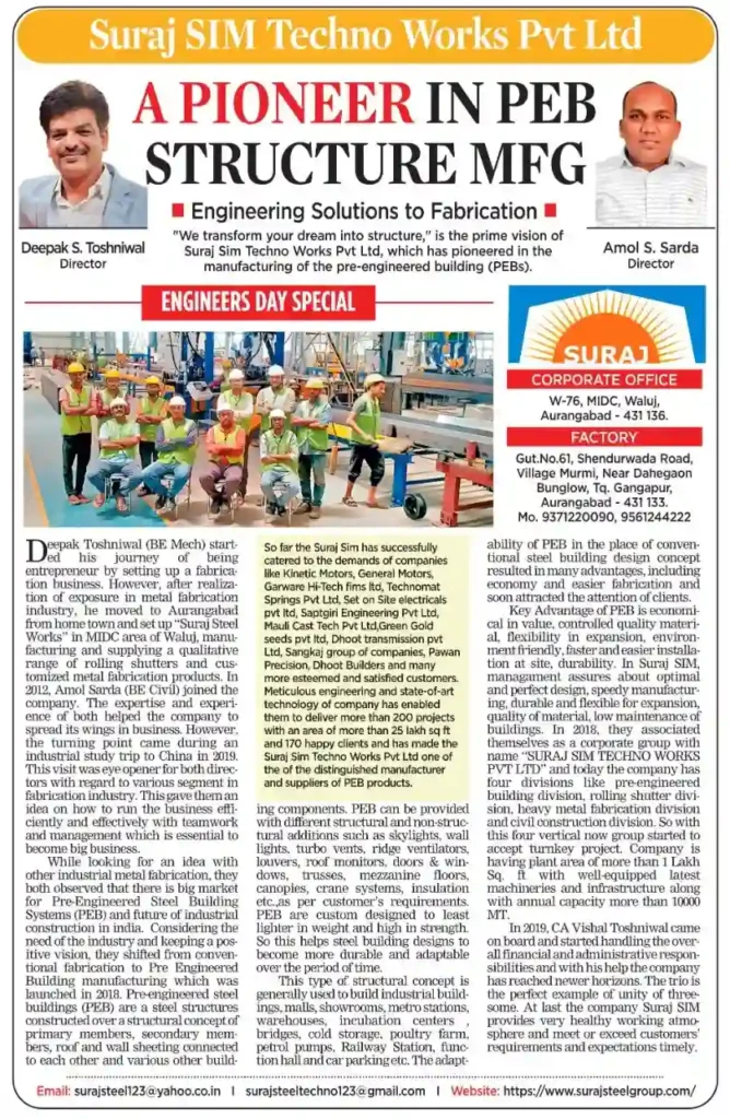 Suraj SIM Techno Works Pvt. Ltd., based in Sambhaji Nagar, is a prominent player in the Pre-Engineered Buildings (PEBs) and high-tech fabrication solutions. Part of a family of engineers, the company was founded by Deepak S. Toshniwal (BE Mechanical) and subsequently Amol S. Sarda (BE Civil), and it has expanded to become a reliable supplier of industrial and commercial-scale infrastructure. The company started out as a small fabrication unit: Suraj Steel Works.